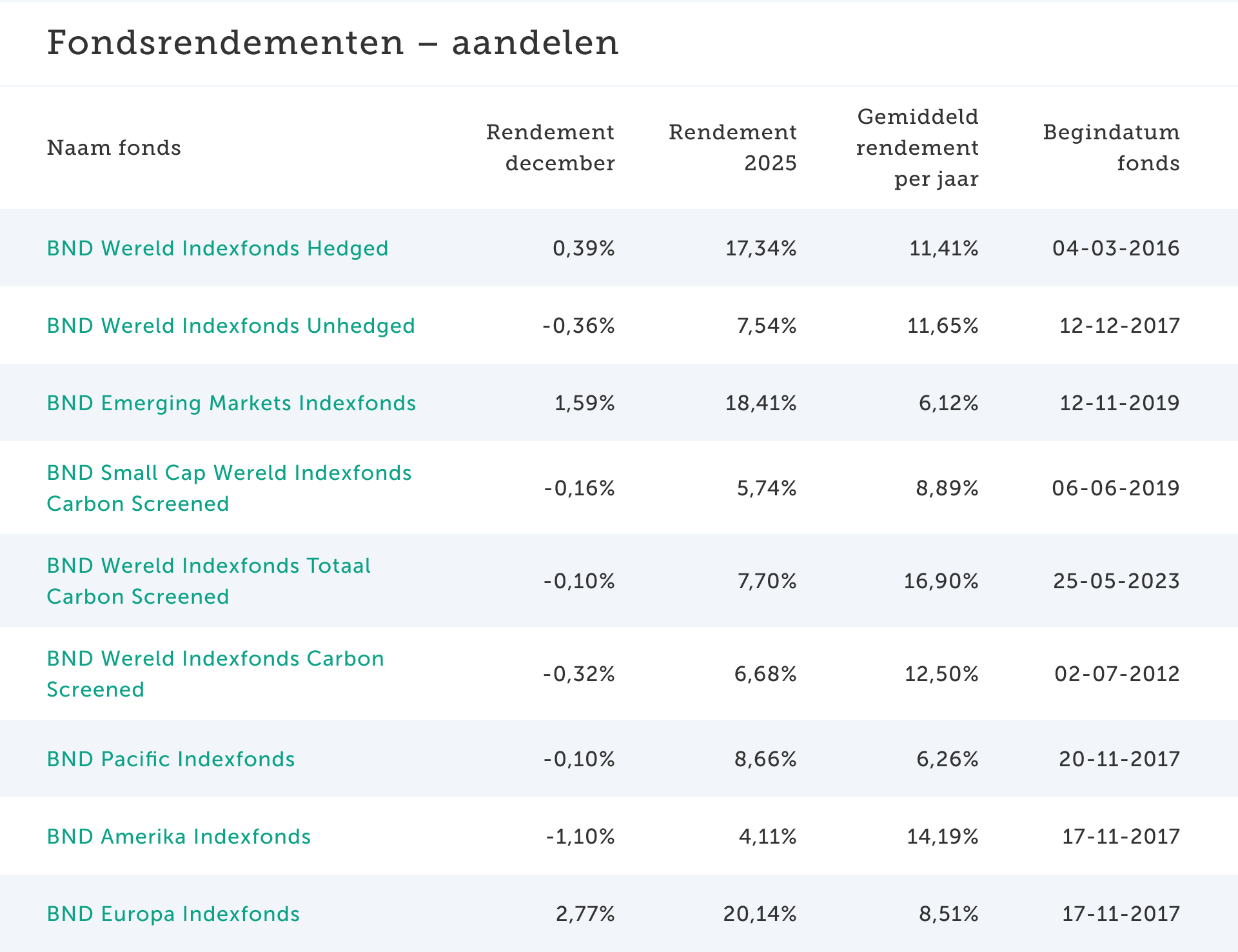 Daarbij publiceerde de Amerikaanse overheid verschillende macro-economische cijfers. Beleggers reageerden hier voorzichtig op, omdat de manier waarop sommige inflatiecijfers worden berekend onlangs is aangepast. Dat maakt het lastiger om direct conclusies te trekken. Die terughoudendheid zorgde bij veel aandelenfondsen voor een korte daling. Het BND Europa Indexfonds vormde daarop een uitzondering. Europese aandelen zijn minder gevoelig voor uitspraken van de Amerikaanse centrale bank en overheid. Daardoor bleef dit fonds stabieler en noteerde het een rendement van 2,77%. Over de hele maand behaalden onze aandelenfondsen rendementen tussen -1,10% en 2,77%.
