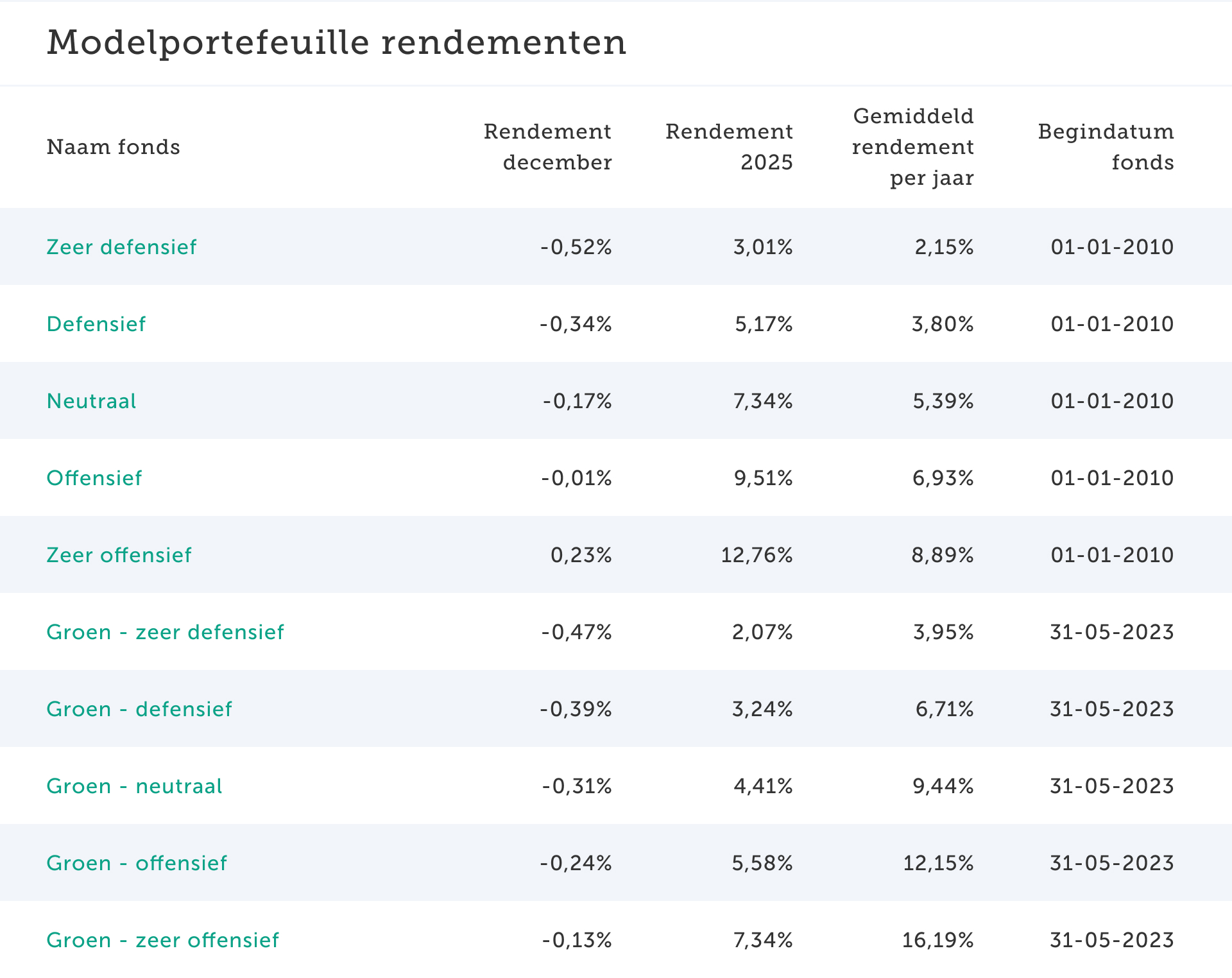 De resultaten van de modelportefeuilles worden bepaald door de verhouding tussen aandelenfondsen en obligatiefondsen. Defensieve modelportefeuilles, waarin een groter deel in obligatiefondsen wordt belegd, lieten deze maand licht negatieve rendementen zien. Offensieve modelportefeuilles, waarin juist meer in aandelenfondsen wordt belegd, bewogen sterker mee met de aandelenmarkten en bleven daardoor stabieler.
