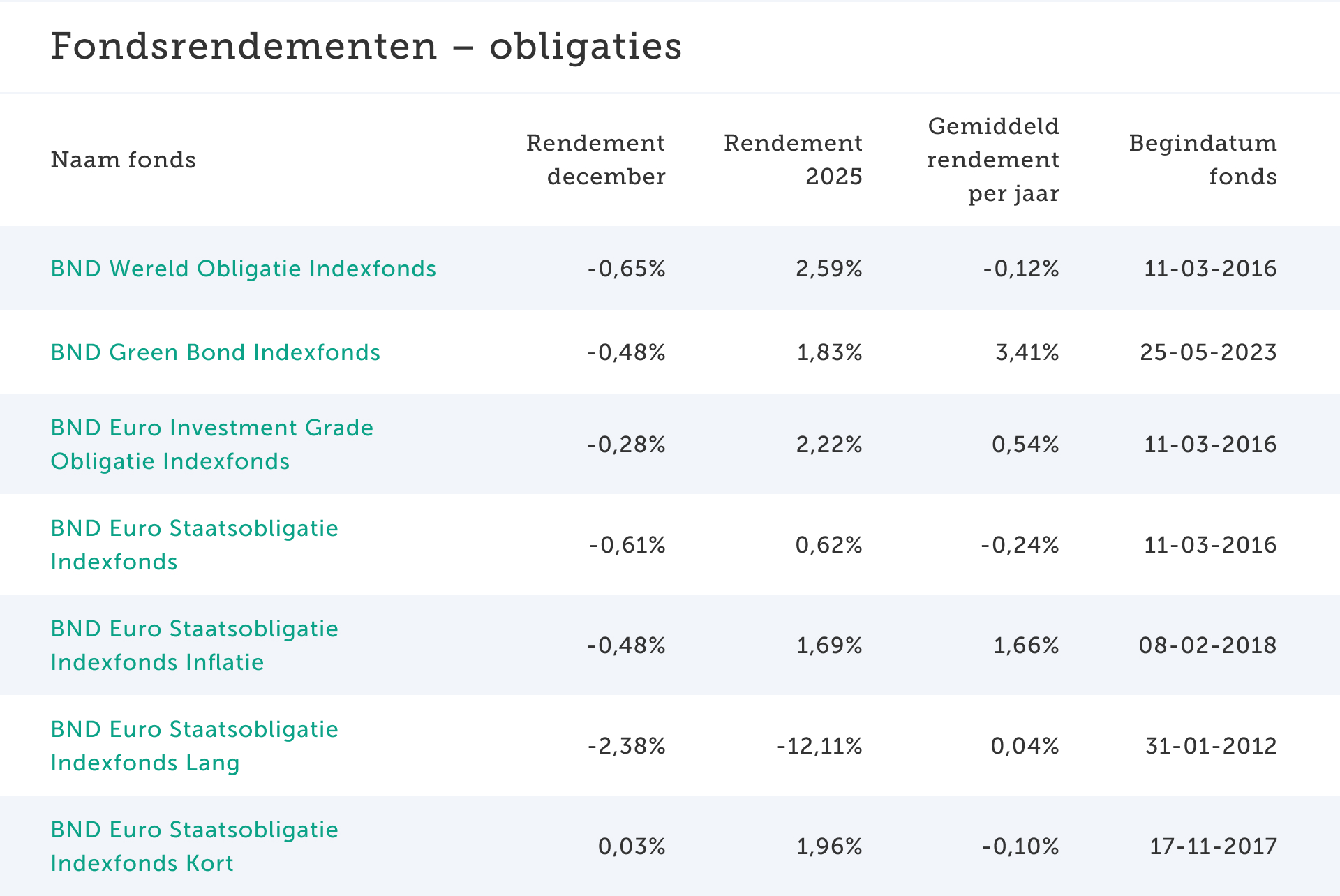 Obligaties met een lange looptijd, leningen die pas over twintig jaar of later aflopen, reageren sterker op renteveranderingen. Dat zagen we terug bij het BND Euro Staatsobligatie Indexfonds Lang, dat belegt in Europese staatsobligaties met looptijden van twintig jaar en langer. Door die lange looptijden is dit fonds extra gevoelig voor stijgende rentes. Obligatiefondsen met kortere looptijden, zoals het BND Euro Staatsobligatie Indexfonds, daalden minder sterk. Onze obligatiefondsen noteerden rendementen tussen de -2,38% en 0,03%.