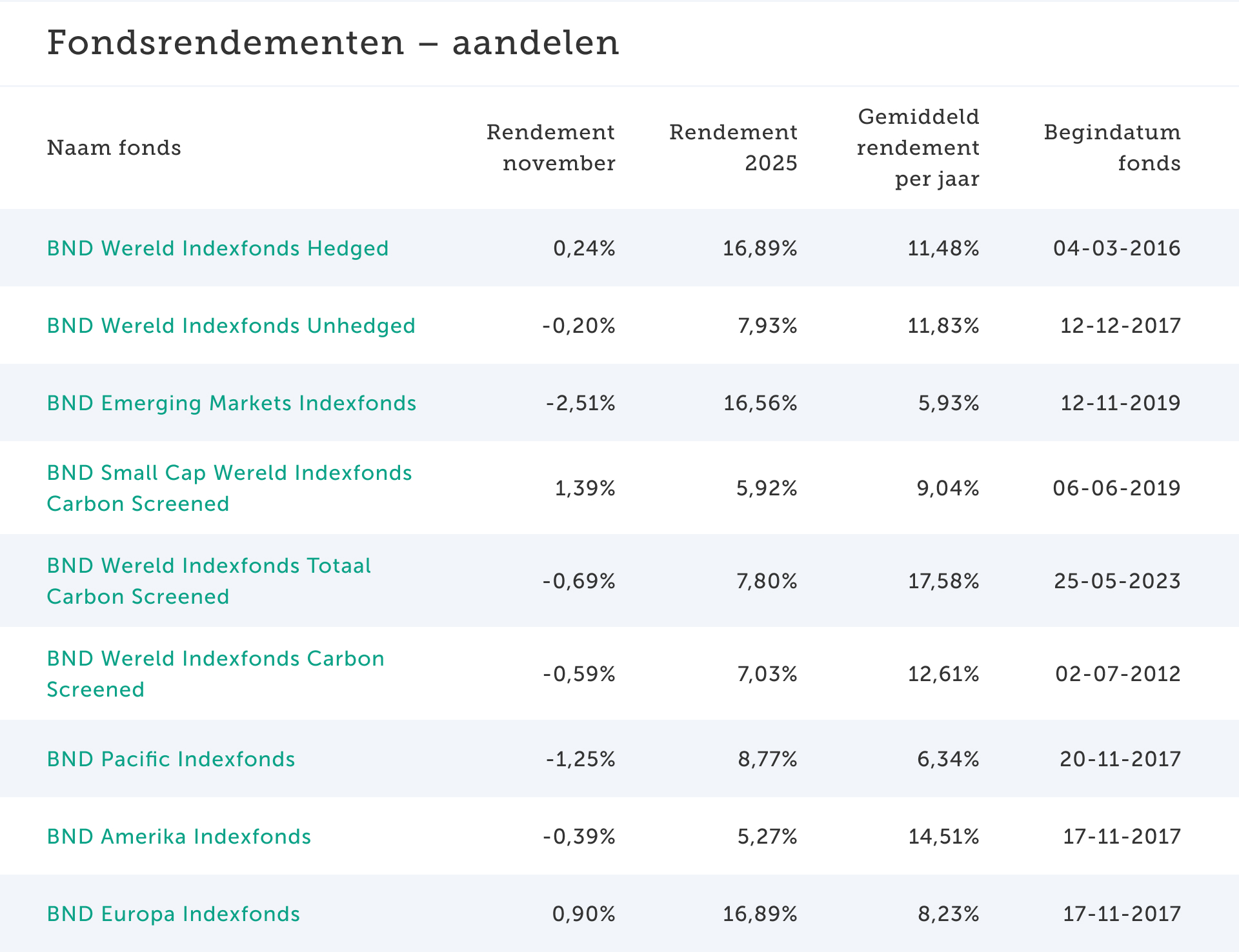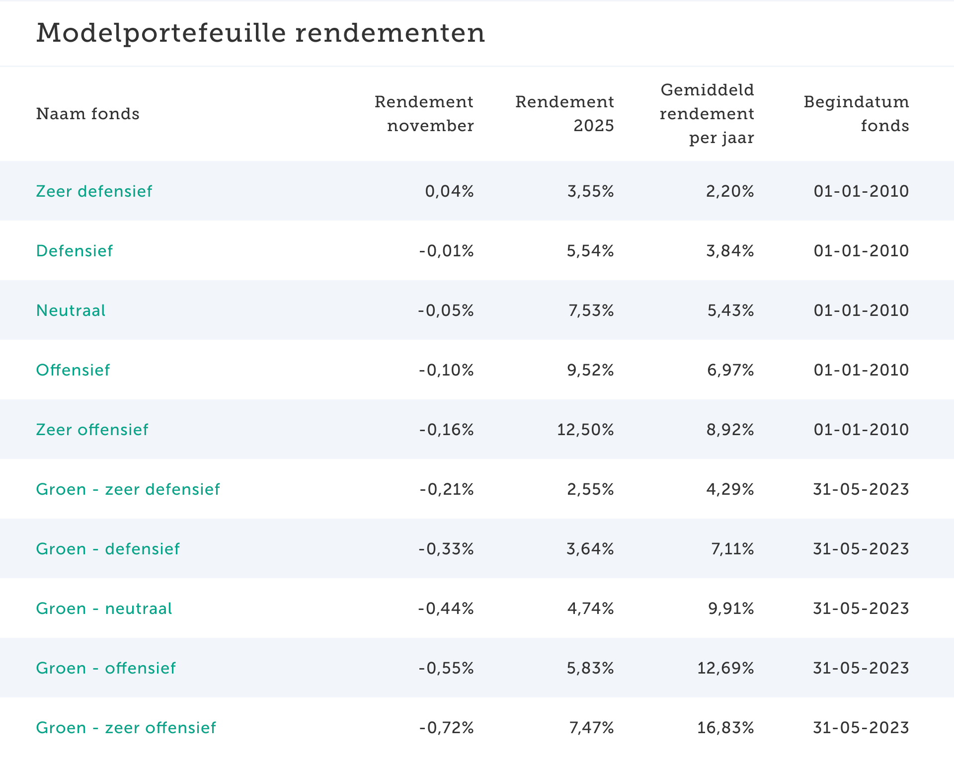 Hierboven ziet u de rendementen voor de volledige maand november. Bent u in de tussentijd in- of uitgestapt, heeft u bijgestort of een bedrag opgenomen, is uw risico automatisch afgebouwd of is er in de tussentijd iets veranderd aan uw beleggingen? Dan kan uw rendement afwijken van de getoonde cijfers.