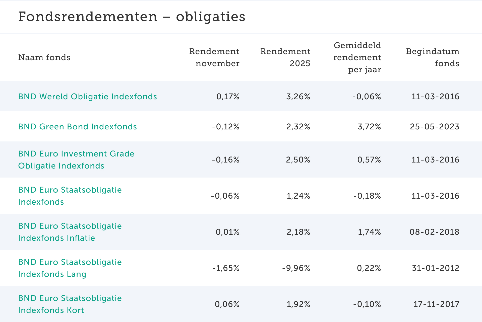 Niet alle obligatiefondsen presteerden even stabiel. Het BND Euro Staatsobligatie Indexfonds Lang bleef achter. Dit fonds belegt in Europese staatsobligaties met lange looptijden, van twintig jaar en langer. Door die lange looptijden reageert het fonds extra sterk op renteveranderingen. De afgelopen maand is de langetermijnrente in de eurozone licht gestegen, waardoor de koersen van obligaties met een lange looptijd daalden. Zo ook het BND Euro Staatsobligatie Indexfonds Lang. Deze lichte rentestijging komt doordat de Europese Centrale Bank géén wijziging in haar rentebeleid heeft doorgevoerd. Als beleggers verwachten dat de rente nog lange tijd hoog blijft, gaan vooral de rentes op langlopende obligaties omhoog