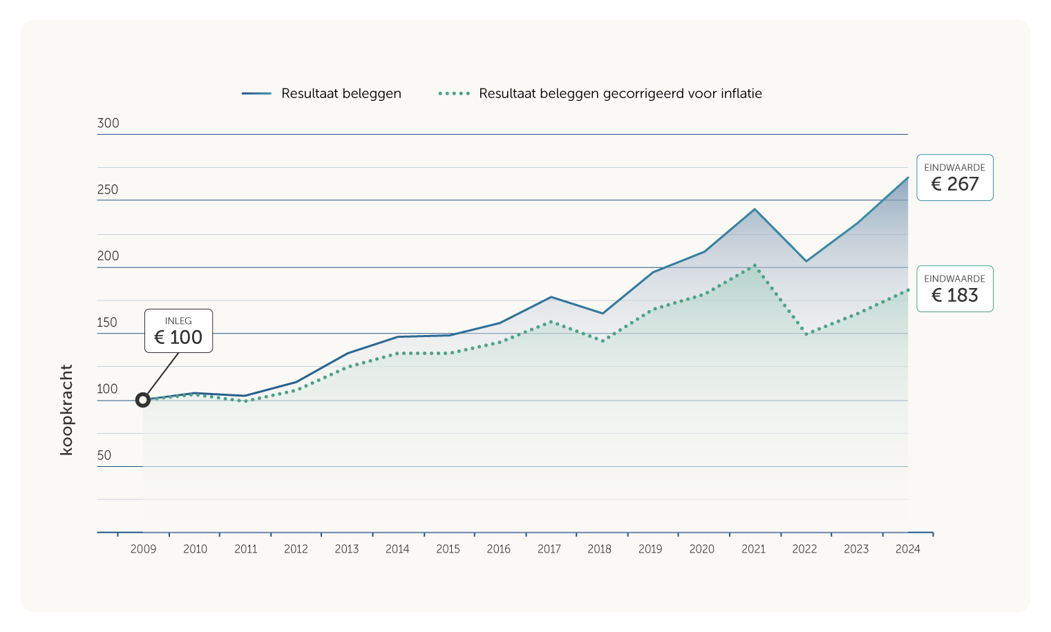Beleggen kan die bescherming deels wél bieden. Wie risico’s accepteert, geduld heeft en zijn of haar emoties onder controle heeft als de beurs daalt, heeft historisch gezien een betere kans om zijn koopkracht te behouden of zelfs te vergroten. Zo maakt u op de lange termijn de grootste kans op een goed rendement.
