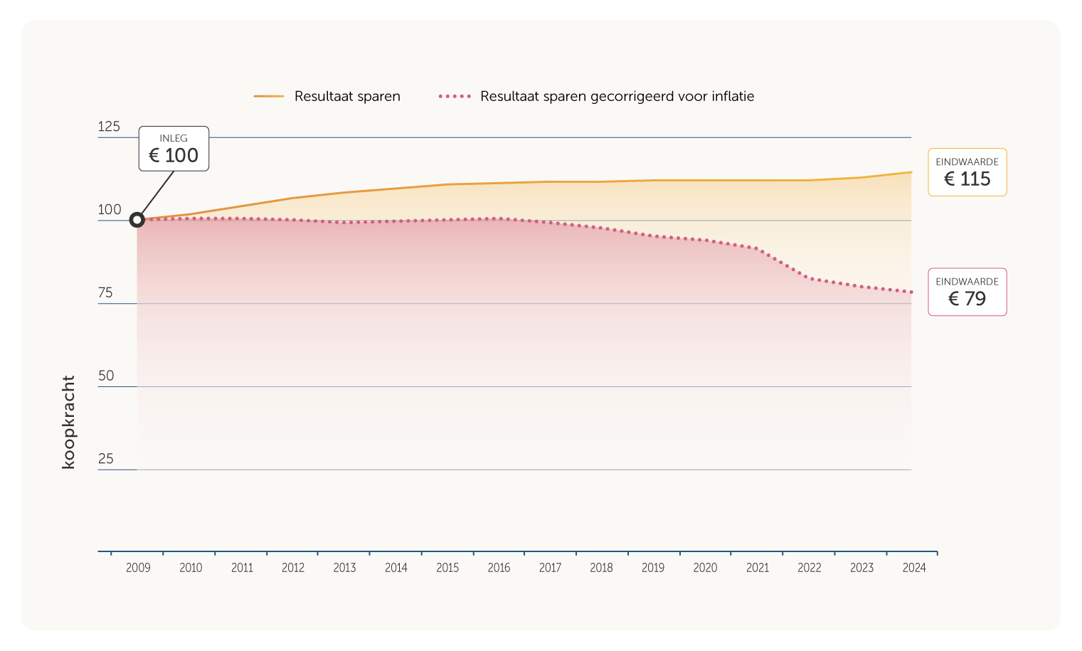 Daardoor neemt de koopkracht van uw spaargeld af. U kunt, anders gezegd, met hetzelfde bedrag minder kopen dan voorheen. In de grafiek is dat goed te zien. Stel dat u vijftien jaar geleden € 100 op een spaarrekening zette. Dan heeft u nu € 115. Maar de koopkracht van dat bedrag is naar de maatstaven van 2010 nog maar € 79. Uw geld is in de tussentijd dus ongeveer 20% in waarde gedaald.