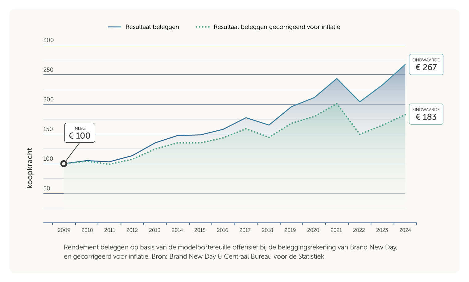 Toch blijkt uit de geschiedenis dat beleggen op de lange termijn vaak helpt tegen inflatie. De offensieve modelportefeuille van Brand New Day heeft de inflatie de afgelopen vijftien jaar bijvoorbeeld duidelijk verslagen. Wie in 2010 € 100 belegde, hield na kosten én inflatie € 183 aan koopkracht over. Dat is meer dan twee keer zoveel als bij sparen.