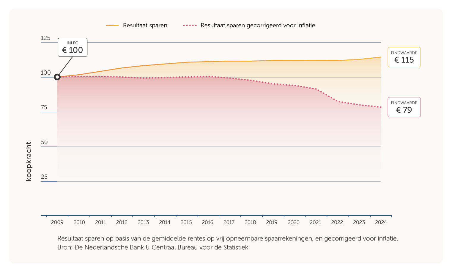 Daardoor neemt de koopkracht van uw spaargeld af. U kunt, anders gezegd, met hetzelfde bedrag minder kopen dan voorheen. In de grafiek is dat goed te zien. Stel dat u vijftien jaar geleden € 100 op een spaarrekening zette. Dan heeft u nu € 115. Maar de koopkracht van dat bedrag is naar de maatstaven van 2010 nog maar € 79. Uw geld is in de tussentijd dus ongeveer 20% in waarde gedaald.