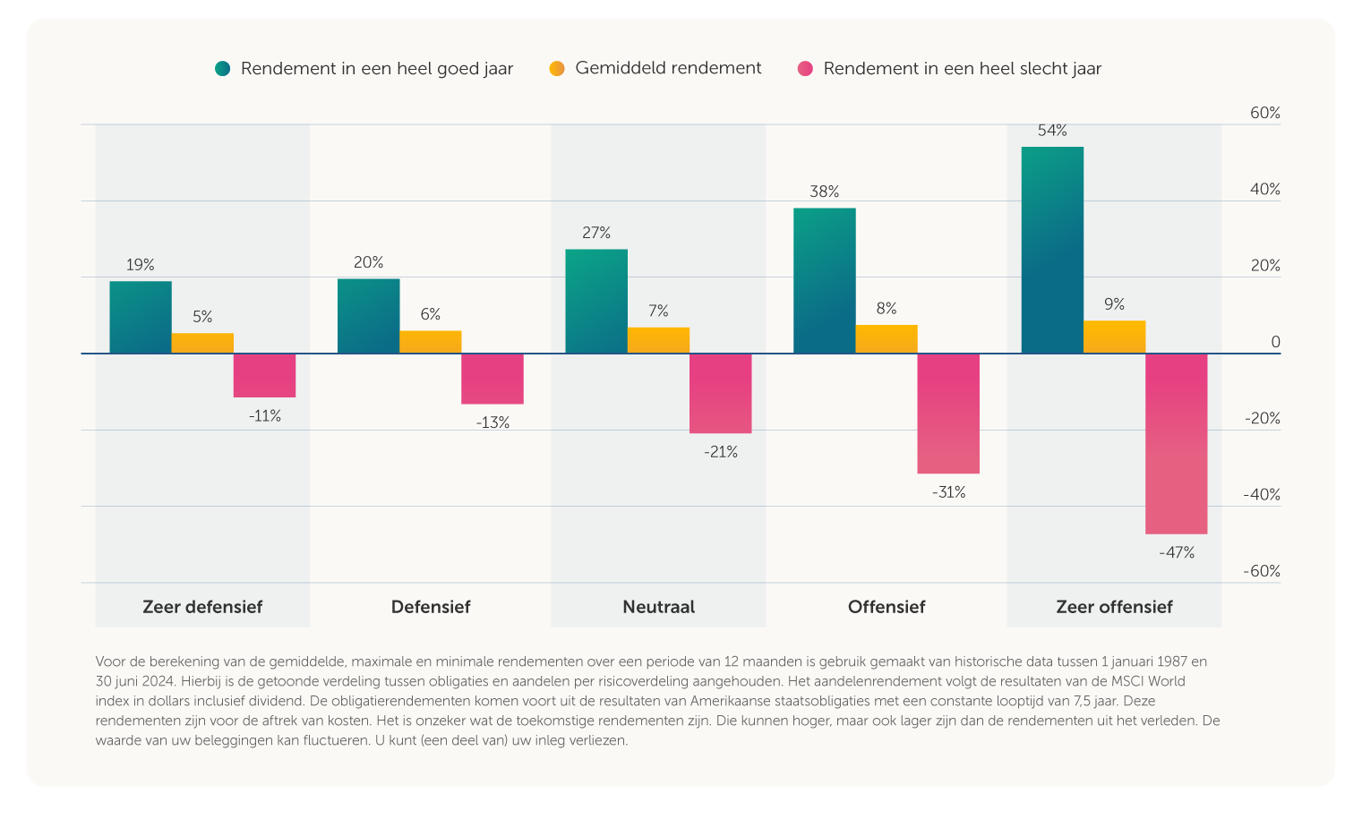 Het kiezen voor potentieel meer rendement gaat dus samen met het kiezen voor potentieel meer risico, dat zien wij ook in onderstaande grafiek. Naarmate een profiel offensiever is, loopt het verschil tussen de winst in een heel goed jaar en een verlies in een heel slecht jaar verder uiteen. Daartegenover staat wel dat bij een offensiever profiel tot nu toe een hoger gemiddeld rendement per jaar is behaald.