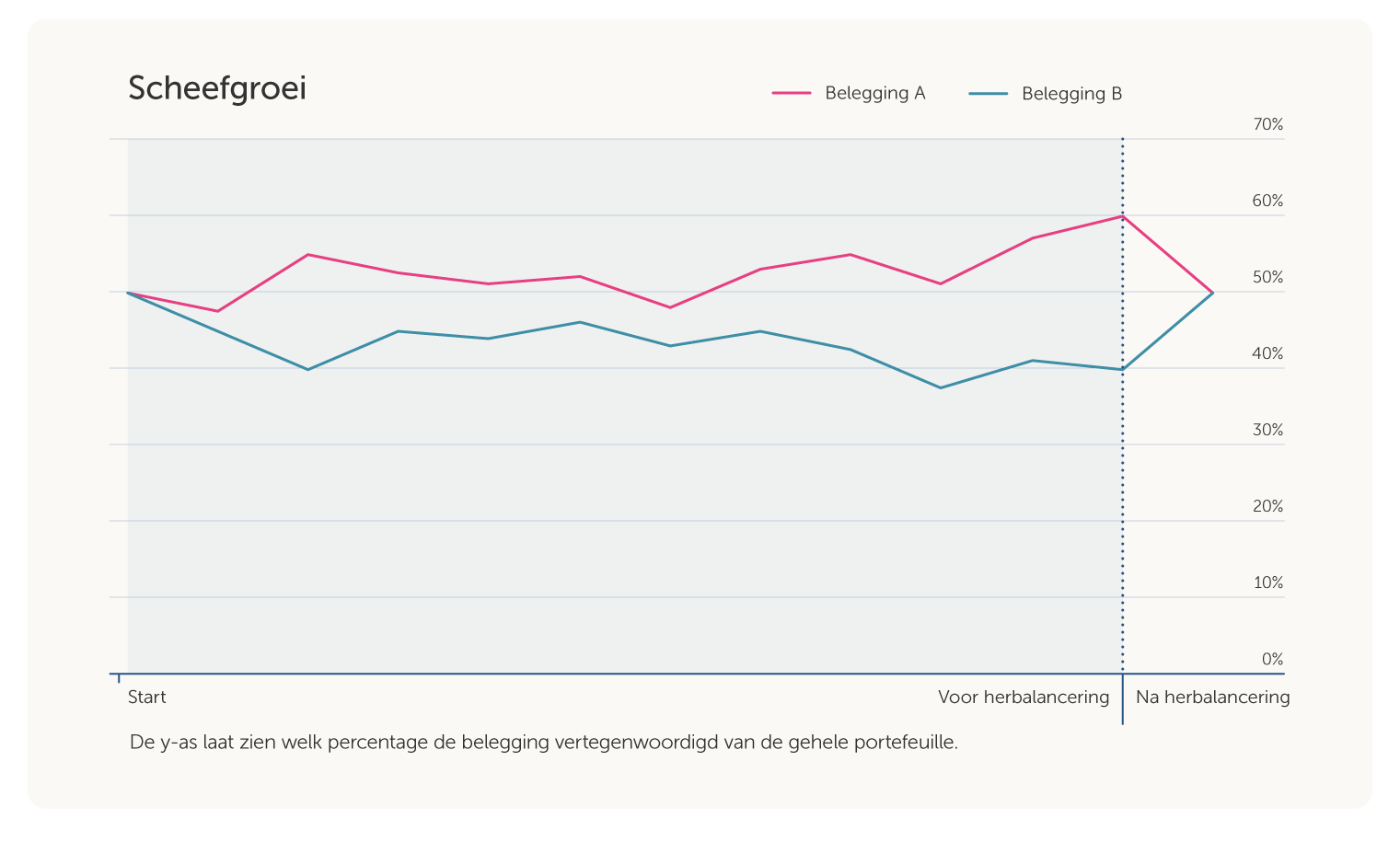 Aan het begin vertegenwoordigen beide fondsen 50% van uw portefeuille. Door koersontwikkelingen eindigt fonds-A op € 12, en fonds-B op € 8. De totale waarde is nog steeds € 20, maar fonds-A is nu 60% van uw portefeuille en fonds-B nog maar 40%. Uw gekozen verdeling (50%/50%) is verdwenen: er is scheefgroei ontstaan.