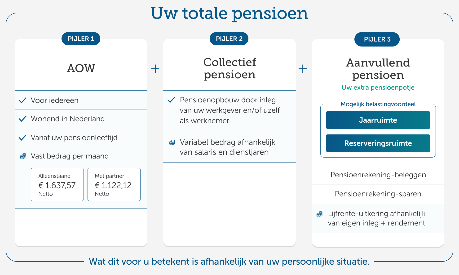 Mijnpensioenoverzicht.nl geeft u een goed een idee van wat u als gepensioneerde financieel staat te wachten. Voor een iets uitgebreider beeld hebben wij op onze website deze pensioenplanner, een gratis rekenhulpmiddel. Zit u goed later, of lijkt het erop dat u het met alleen pensioen uit pijlers 1 en 2 niet gaat redden? Dan heeft u een pensioentekort. Daarin staat u bepaald niet alleen en veel mensen kiezen er daarom voor om zelf nog een éxtra pensioenpotje op te bouwen. In de derde pijler dus. Welk bedrag u ook nodig heeft: hoe eerder u begint, hoe voordeliger.