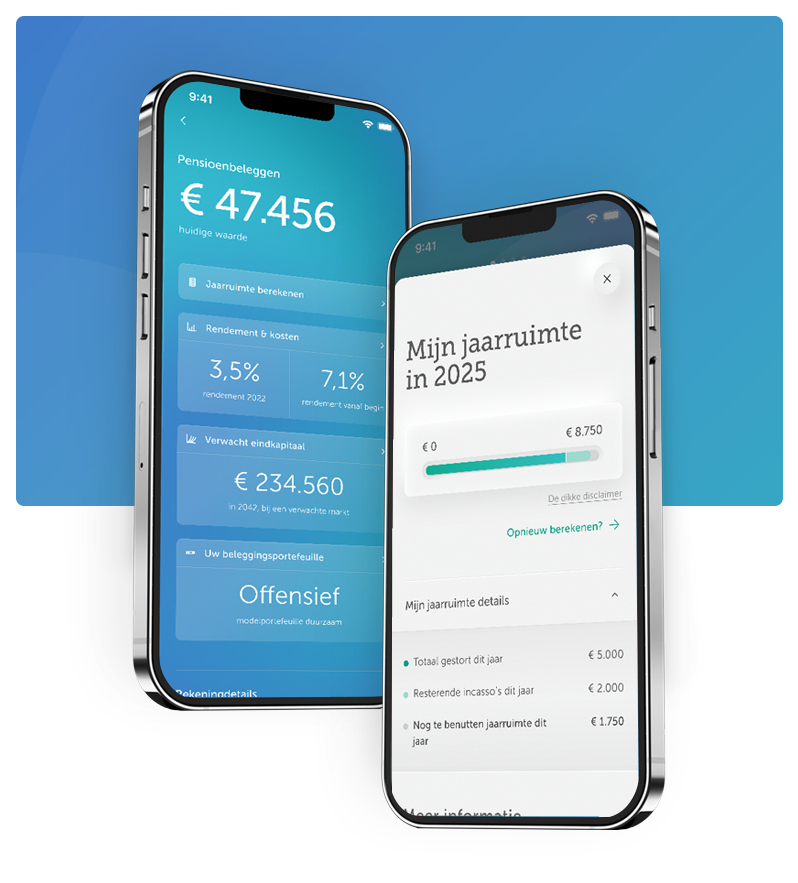 Heeft u een pensioenrekening? Dan weet u hoe belangrijk jaarruimte is. Bereken en sla uw jaarruimte op in de Brand New Day-app en u weet voortaan altijd hoeveel u overheeft en welk bedrag u dit jaar nog mag storten. Zo stort u nooit te veel (of te weinig) en profiteert u maximaal van het belastingvoordeel.