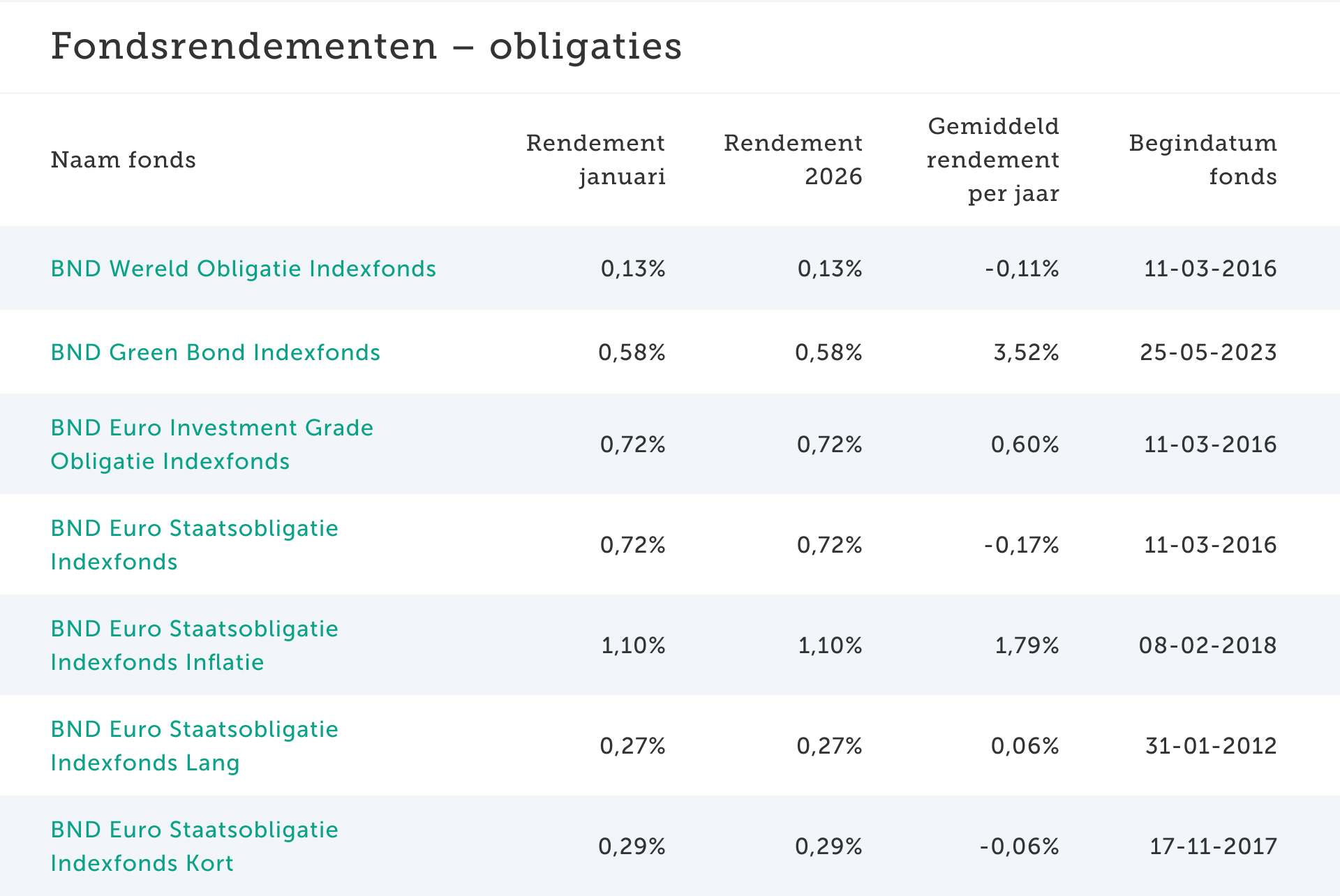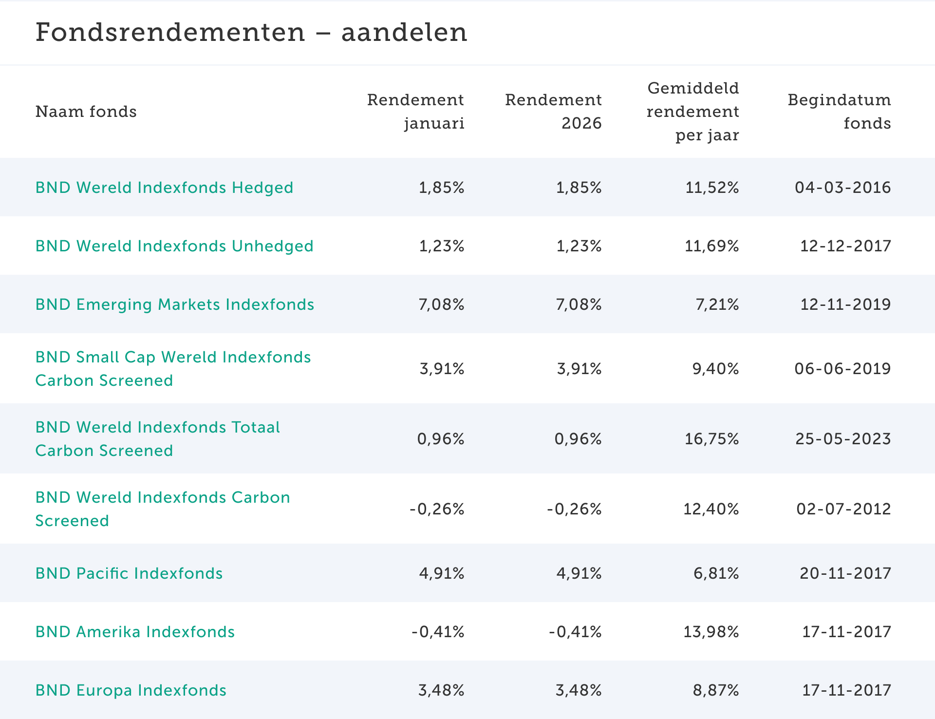 Ook de wisselkoers van de dollar speelde een belangrijke rol deze maand. In 2025 verloor de dollar ongeveer 11,50% ten opzichte van de euro. En in januari daalde de dollar opnieuw één procent. Dat had invloed op fondsen waarbij het valutarisico niet is afgedekt, zoals het BND Wereld Indexfonds Unhedged. Aandelen die in dollars worden verhandeld, zijn in euro’s minder waard wanneer de dollar verzwakt.