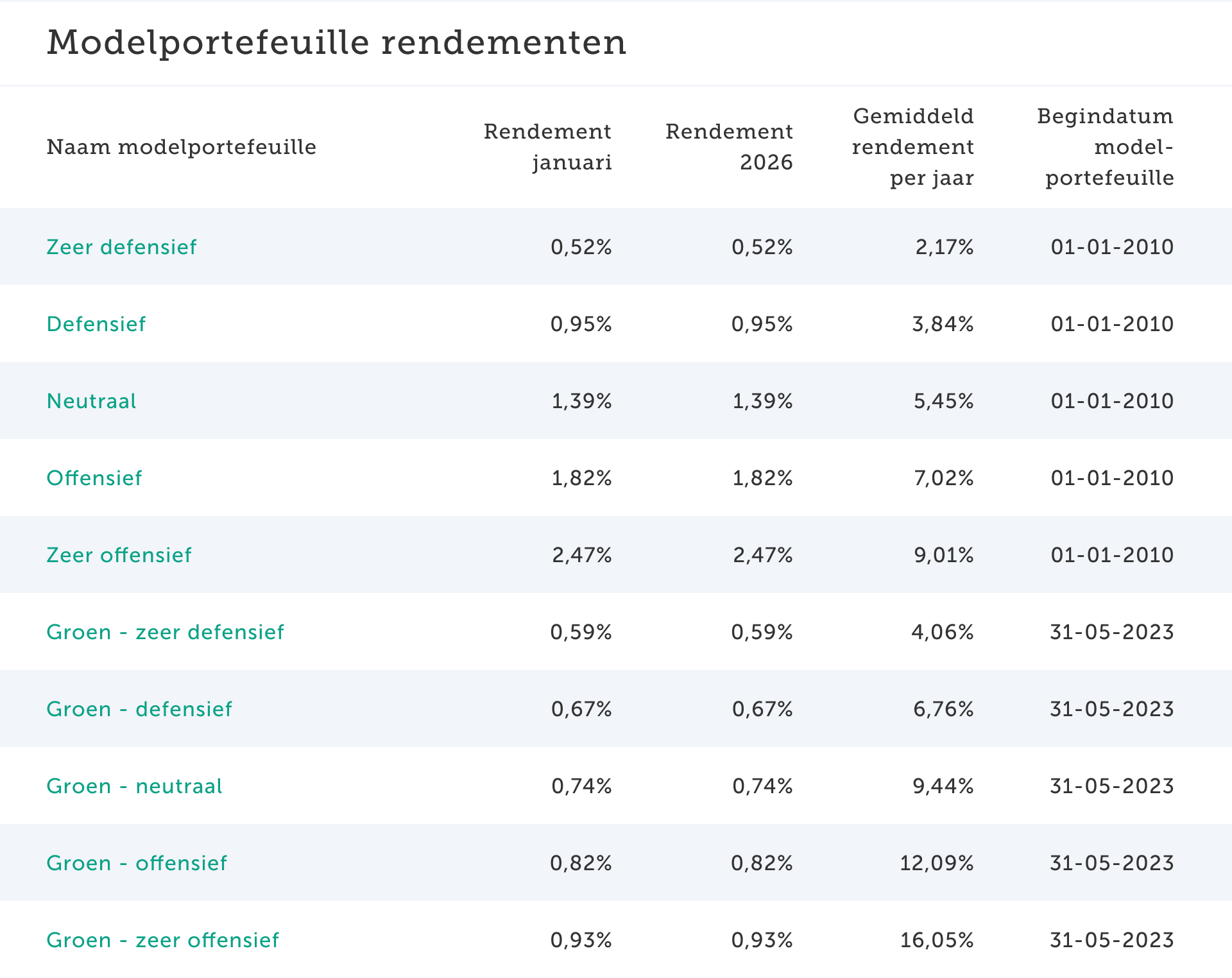 Hierboven ziet u de rendementen voor de volledige maand januari. Bent u in de tussentijd in- of uitgestapt, heeft u bijgestort of een bedrag opgenomen, is uw risico automatisch afgebouwd of is er in de tussentijd iets veranderd aan uw beleggingen? Dan kan uw rendement afwijken van de getoonde cijfers.