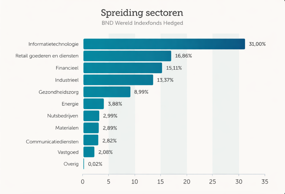 De spreiding van het Brand New Day Wereld Indexfonds Hedged (in maart 2025) over verschillende sectoren.