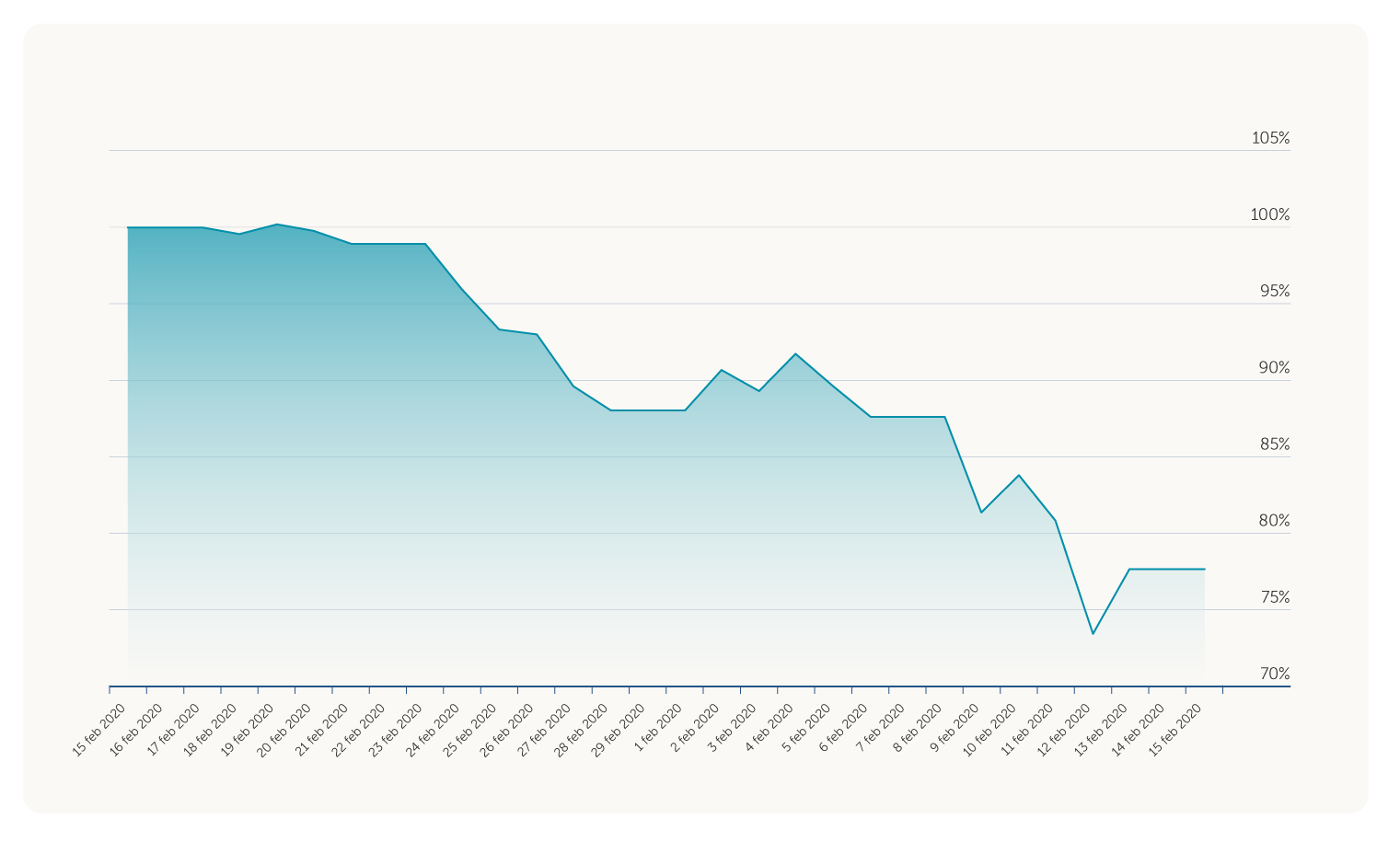 Kijk maar eens. Hieronder ziet u het kortetermijneffect van de uitbraak van het coronavirus op de beurs. Ons Wereld Indexfonds Hedged daalde toen in korte tijd maar liefst 25% in waarde.