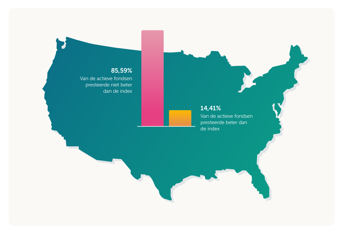 Kijk maar eens naar de prestaties van actieve fondsbeheerders (fondsen die ‘op het juiste moment’ beleggingen aan- en verkopen voor hun klanten, om zo een zo groot mogelijk rendement te halen) versus de index. Die actieve fondsen presteren gemiddeld een stuk slechter. En áls het ze al lukt om de index te verslaan, dan gebeurt dat zeker niet ieder jaar opnieuw. U kunt daarom beter gewoon een index volgen.