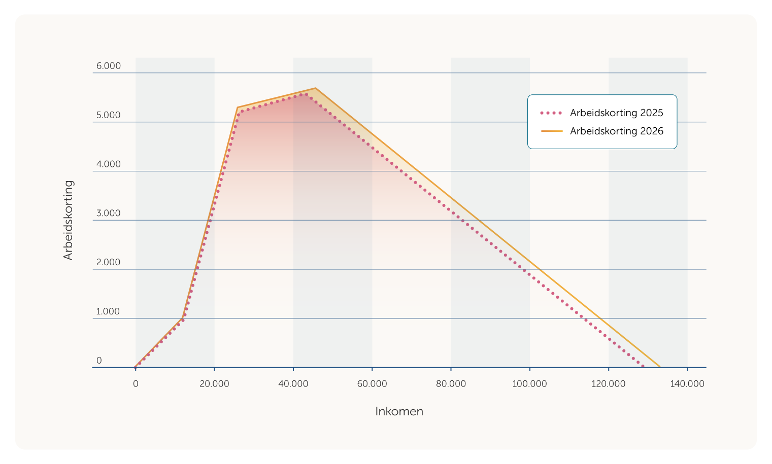 De arbeidskorting werkt met een opbouw- en afbouwtraject. In 2026 worden de inkomensgrenzen van de eerste twee knikpunten verlaagd, van € 12.169 naar € 11.965 en van € 26.288 naar € 28.845. Daardoor krijgen mensen met lagere inkomens iets meer arbeidskorting.