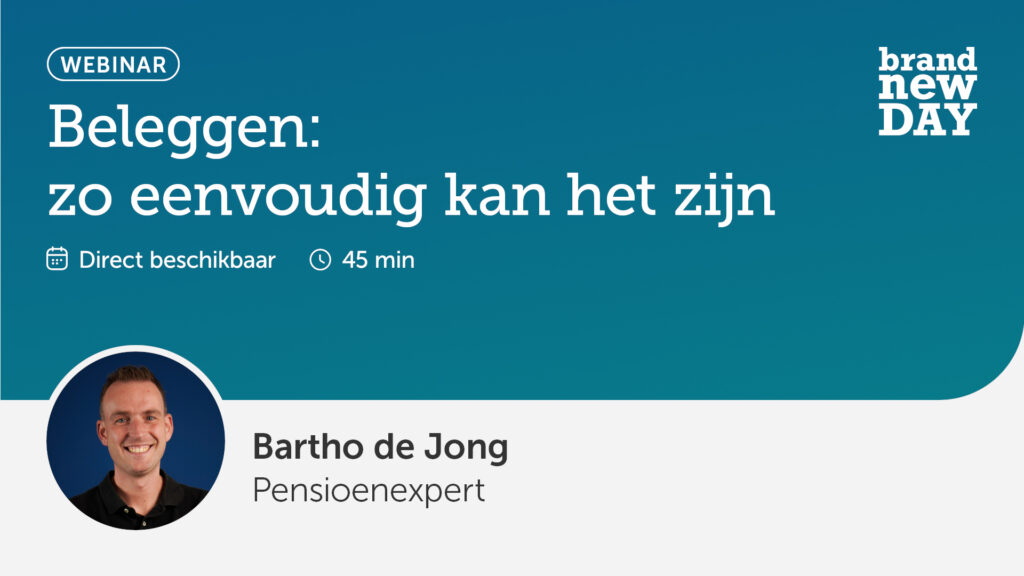 Beleggen ingewikkeld? Niet bij ons. Wilt u uw geld een zetje geven en vraagt u zich af of beleggen iets voor u is? Misschien wilt u gewoon beter begrijpen hoe het werkt. Gelukkig hoeft u bij ons echt geen beursexpert te zijn. Bartho de Jong (pensioenexpert) van Brand New Day laat in dit webinar zien hoe eenvoudig beleggen kan zijn, ook voor u.