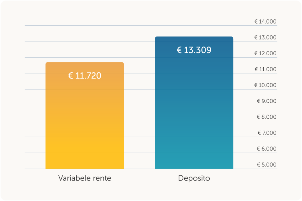 Stel dat u € 10.000 vastzet voor tien jaar tegen een rente van 2,90% per jaar, dan groeit dit naar € 13.309. Bij een variabele rente van 1,60% per jaar groeit het naar € 11.720. Dat is een verschil van €1.589.