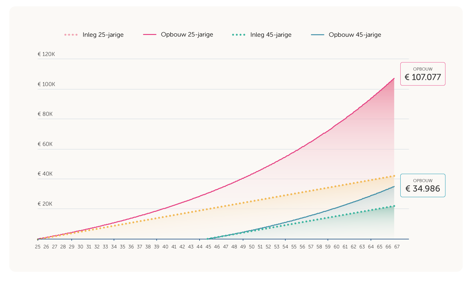 De persoon die in dit voorbeeld op haar 25e is begonnen met pensioenopbouw, heeft op haar AOW-leeftijd € 42.000 ingelegd en kan daarmee rekenen op een aanvullend pensioen van ruim € 1.700 per maand voor vijf jaar lang*. Degene die daarentegen pas op zijn 45e begint, komt uit op een potje van bijna € 35.000 en een maandelijkse uitkering van zo’n € 580 voor vijf jaar lang*. Om op hetzelfde niveau uit te komen als de vroege beginner, zou hij vanaf zijn 45e elk jaar niet € 1.000, maar € 3.060 moeten inleggen.