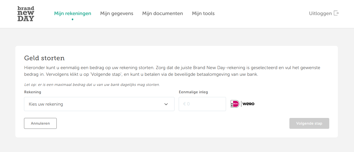 Vervolgens verschijnt een nieuw scherm. U geeft aan op welke Brand New Day-rekening u wilt storten, hoeveel u wilt storten en wat uw bank is. Bij de volgende stap wordt u doorverwezen naar de beveiligde omgeving van uw bank. Daar rondt u de storting af.