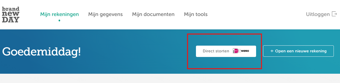 Als u met Wero een storting doet in MijnBND, dan staat het geld direct op uw Brand New Day-rekening. Klik op de blauwe knop Geld storten.